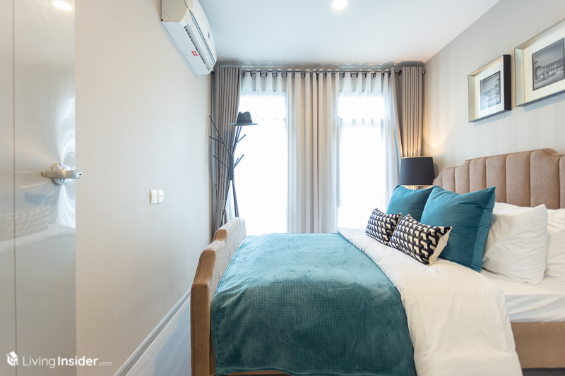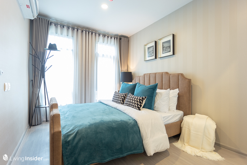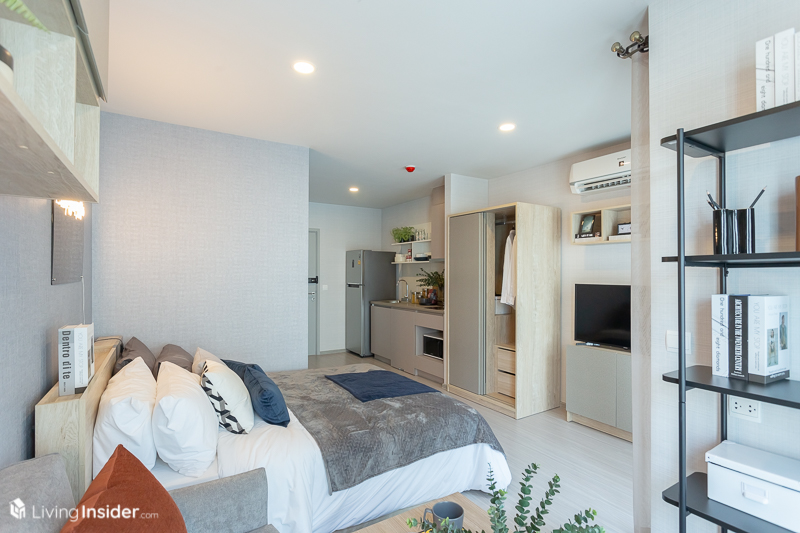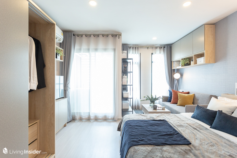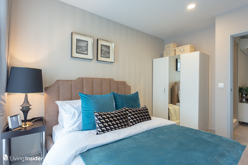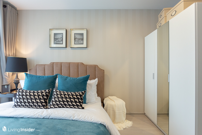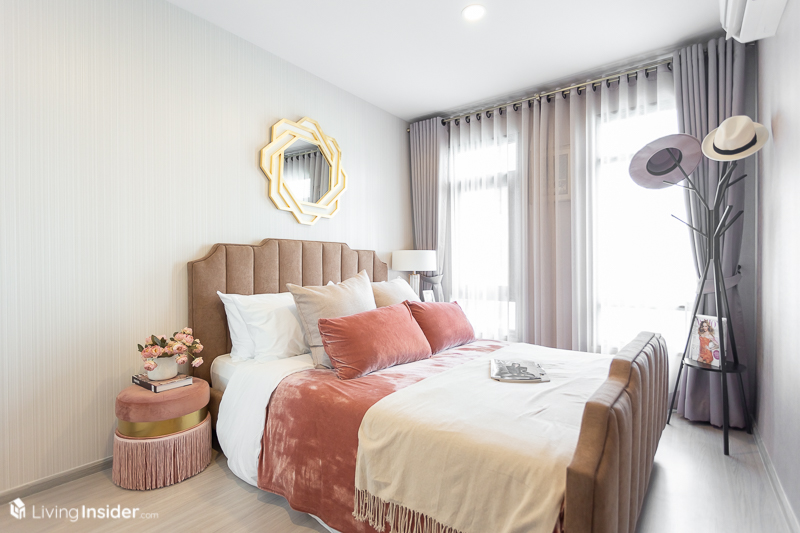 ฝั่งตรงข้ามทางโครงการวางเตียงขนาด 5 ฟุต ให้ดูเป็นตัวอย่างแต่พื้นที่ก็ไม่ได้ดูแคบลงแต่อย่างใด หากใครอยู่คนเดียวอยากได้พื้นที่มากกว่าเดิม แนะนำว่าวางเตียงขนาด 3.5 ฟุต ก็สวยงามไม่แพ้กัน