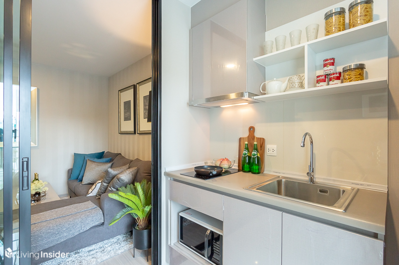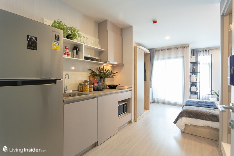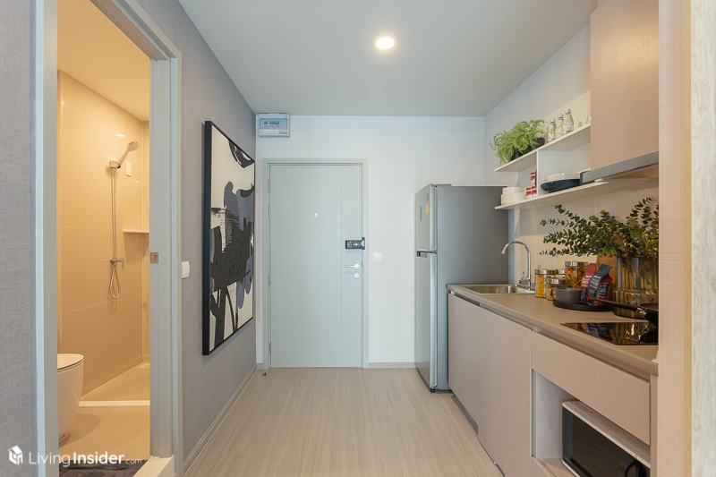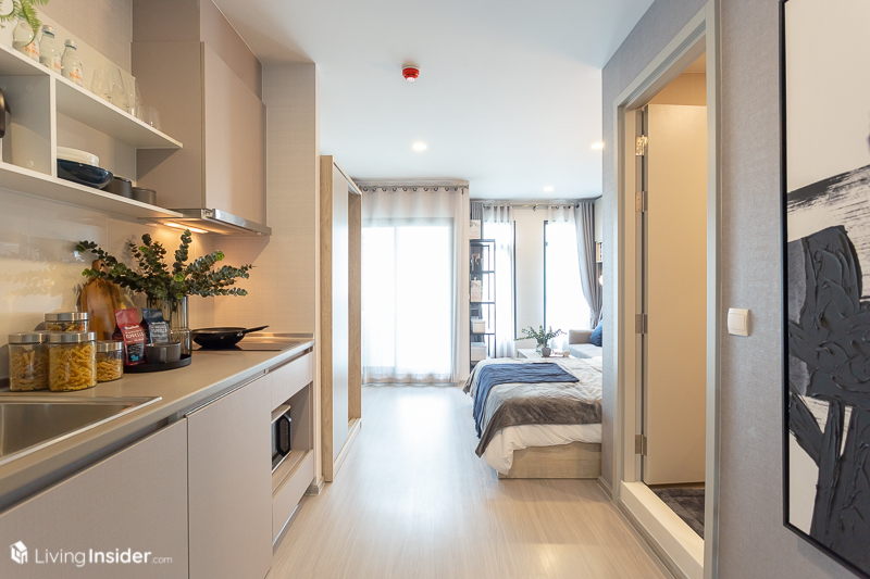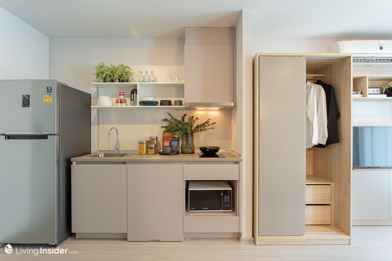 ไปดูกันที่ห้องแรกคือ ►Studio ขนาด 25 ตารางเมตร พบกับส่วนของห้องครัวแบบเปิด ซึ่งทางโครงการให้ในส่วนของเคาน์เตอร์ครัวมาให้ และมีพื้นที่ด้านบนเหลือในการเตรียมอาหาร พร้อมช่องเก็บของด้านบน อีกทั้งยังมีสเปซทางเดินเหลือเฟือ ให้พอวางตู้เก็บรองเท้าหรือตู้เก็บของฝั่งตรงข้ามได้