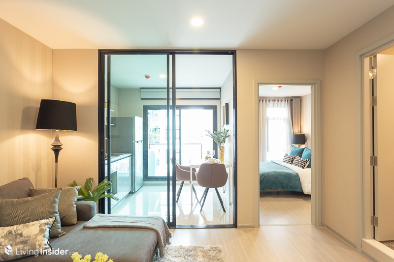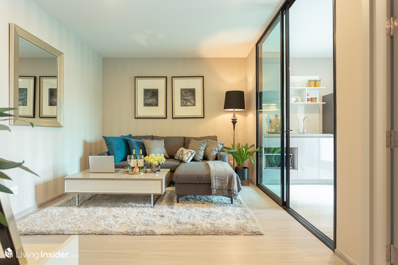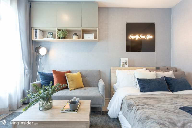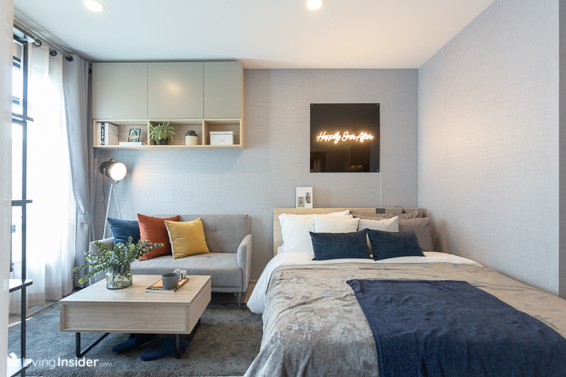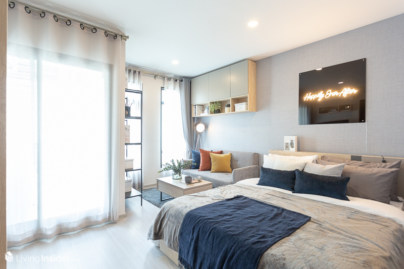 เพื่อให้มีพื้นที่วางได้ทั้งโซฟาขนาด 1-2 ที่นั่ง โต๊ะกลาง และเพิ่มโต๊ะทำงานพร้อมตู้เก็บของเข้าไปอีกได้ หรือจะบิวท์อินเป็นชั้นเก็บของด้านบนแบบในห้องตัวอย่าง ก็เป็นไอเดียที่น่าสนใจไม่เบา โดยมุมนี้จะได้กระจกสองบานช่วยให้ลมธรรมชาติและช่องแสงเข้ามาได้มากขึ้น ส่งผลให้ห้องดูโปร่งและดูกว้างกว่าเดิม