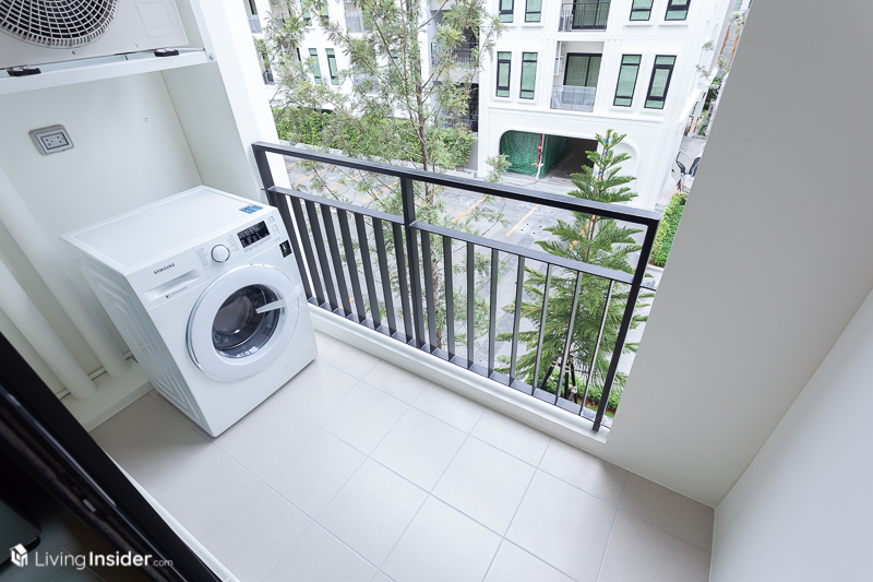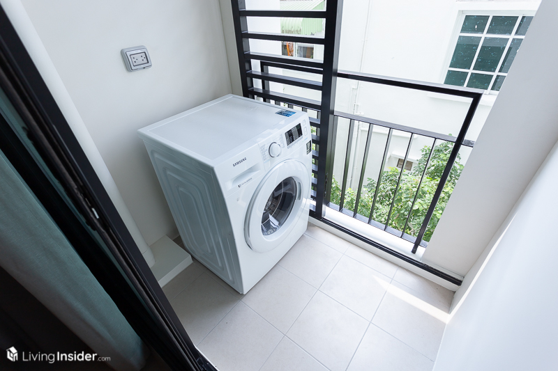 ประกอบกับระเบียงได้ประตูกระจกใสแบบบานเลื่อนยิ่งทำให้ห้องดูไม่อึดอัด ข้างนอกระเบียงไว้วางเครื่องซักผ้าและยังพอมีพื้นที่ให้วางราวตากผ้าได้อีกนิดหน่อย