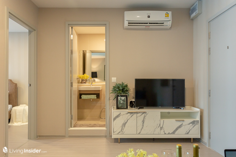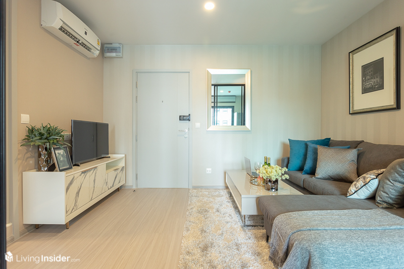 ห้องตัวอย่างสุดท้ายเป็น ►1 Bedroom ขนาด 35 ตารางเมตร ก้าวเข้าสู่ห้องนั่งเล่นเป็นอันแรก มีขนาดค่อนข้างใหญ่เลยทีเดียว ใครที่ชอบนั่งดูหนังพักผ่อนคลายเครียดน่าจะชอบ ฝั่งหนึ่งวางทีวีขนาดเกือบ 50 นิ้วได้สบาย บิวท์อินชั้นวางของด้านบนเพิ่มอีกนิด