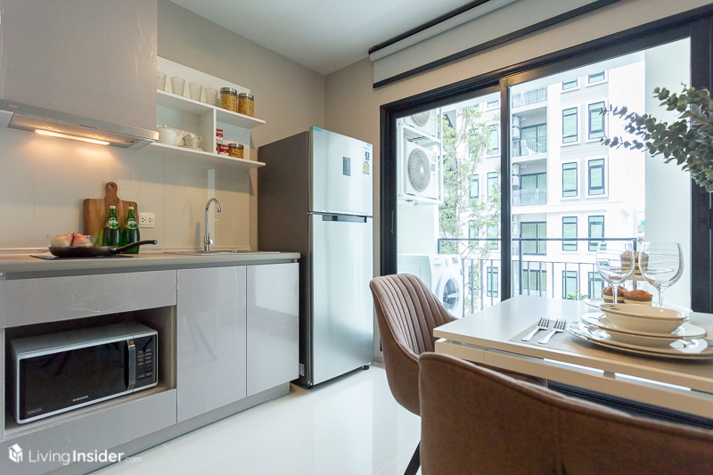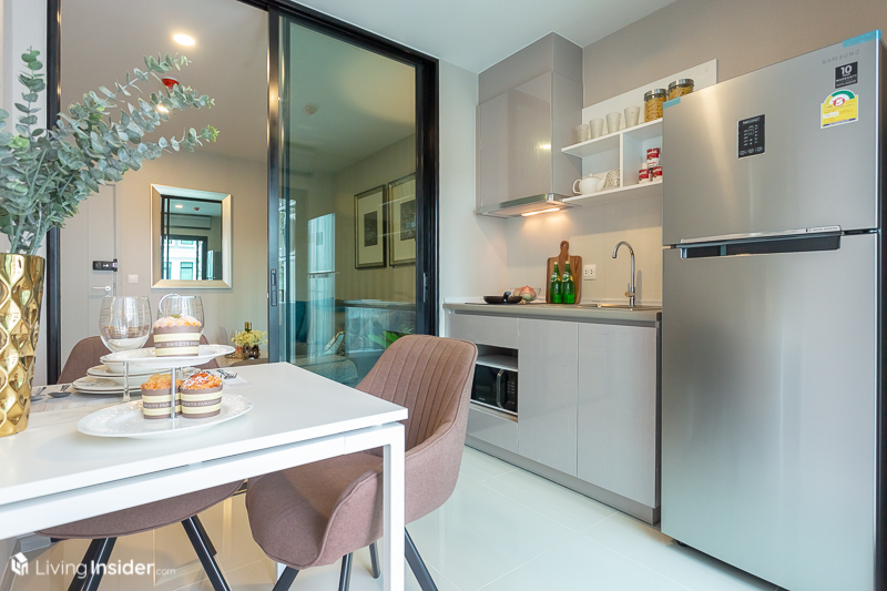 ห้องครัวได้แบบครัวปิด ขนาดกว้างขวาง ใครชอบทำอาหารก็คงแฮปปี้ต้มผัดแกงทอดจัดเต็ม ไม่ต้องกลัวกลิ่นฟุ้งไปห้องอื่น และวางโต๊ะกินข้าวได้ขนาด 2 ที่นั่ง
