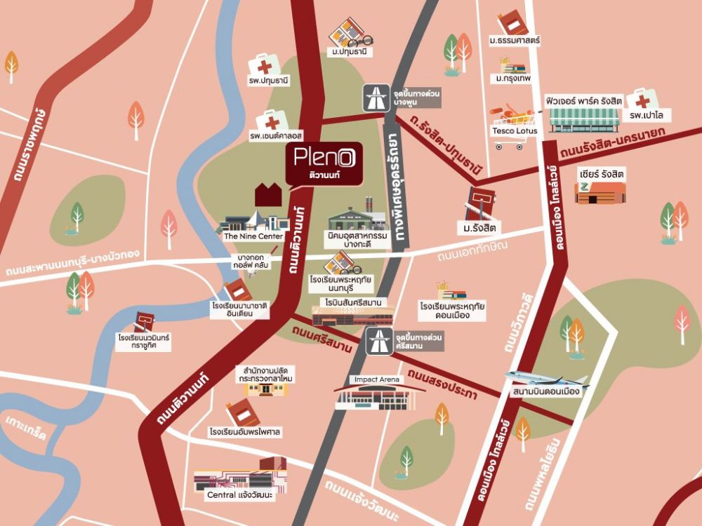 ทำเลศักยภาพดีที่สุดบนถนนติวานนท์ ทางเข้าติดถนนใหญ่ เดิน 5 นาทีถึง เดอะไนน์ เซ็นเตอร์ และใกล้รถไฟฟ้าสายสีแดง (โครงการในอนาคต) มีสิ่งอำนวยความสะดวกครบทุกความต้องการ โดยมีทาวน์โฮม 2 ชั้น และบ้านแฝด 2 ชั้น รวมจำนวน 498 ยูนิต