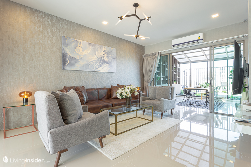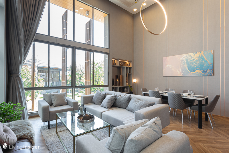 มาถึงไฮไลท์สำคัญของบ้านอย่าง ห้องนั่งเล่น คือดูดีสุดๆ สัมผัสได้ถึงความปลอดโปร่งโล่งสบาย ด้วยการดีไซน์ให้เกิด High Ceiling Double Space สูงถึง 5 เมตร พื้นที่ใช้สอบ 77 ตร.ม. พร้อมกับช่องแสงขนาดใหญ่จากพื้นจนสูงเกือบถึงเพดาน และได้หน้าต่างแบบบานเลื่อน ที่ตรงกับประตูด้านหลังบ้านด้วย จึงทำให้ลมไหลเวียนเข้ามาในห้องได้มากกว่าเดิม