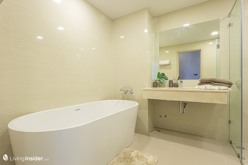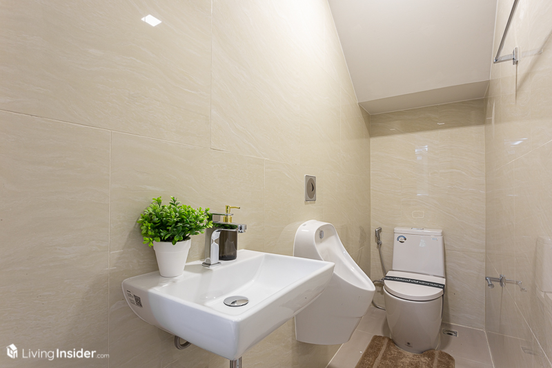 ห้องน้ำ อยู่ตรงกลางมีขนาดใหญ่ เพื่อการใช้งานที่สะดวก สุขภัณฑ์ครบครัน พร้อมติดตั้งฉากกั้นอาบน้ำวัสดุแบบนิรภัยแยกส่วนเปียกส่วนแห้ง เพิ่มเติมตรง Rain Shower อ่างอาบน้ำให้นอนแช่ผ่อนคลายสบายอารมณ์ และทางโครงการเดินระบบน้ำร้อนน้ำเย็นภายในชั้นนี้