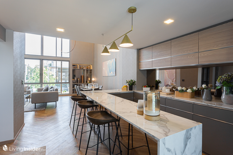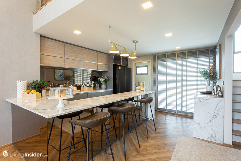 ถัดขึ้นมาที่ชั้นสองเข้าสู่พื้นที่ส่วนตัวของคนในบ้าน เจอในส่วนของ Common area สำหรับ ห้องครัว ทางโครงการเดินระบบท่อน้ำไว้แล้ว สามารถต่อเติมเป็นแบบเปิดพร้อมเคาน์เตอร์บาร์ไว้สำหรับนั่งกินอะไรเล็กๆ น้อยๆ แต่ถ้าครอบครัวไหนเน้นทำอาหารกินกันเองแบบจริงจัง ก็สามารถกั้นห้องเป็นครัวปิดได้ หมดห่วงเรื่องกลิ่นลอยไปห้องอื่น