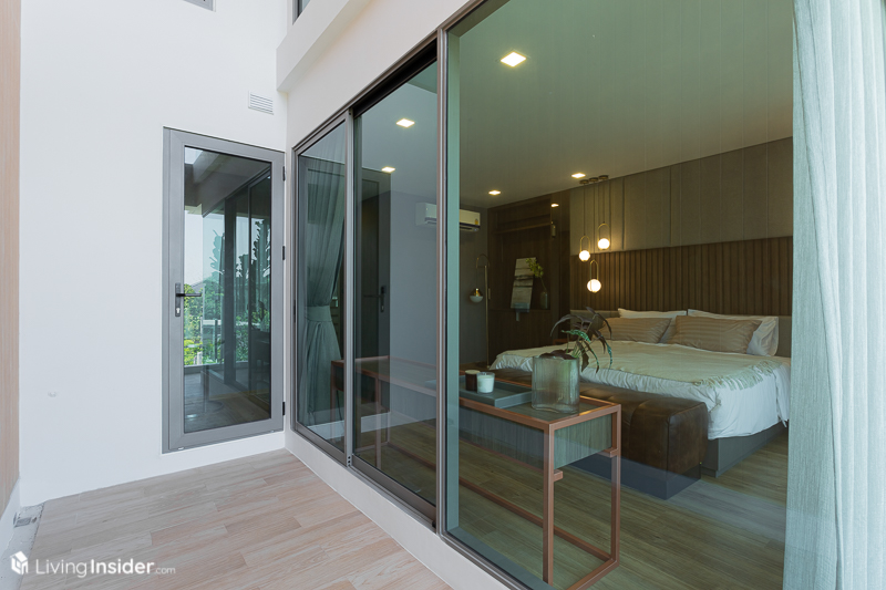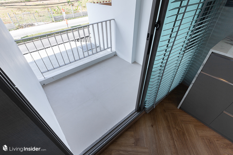แต่ถ้าอยากนั่งรับลมเย็นข้างนอกก็มี ระเบียงส่วนตัวอยู่ภายในห้อง มาในรูปแบบตัว L แบ่งพื้นที่ปลูกต้นไม้เพิ่มความเขียวขจี เวลามองจากภายในห้องได้รู้สึกสดชื่นสบายตา