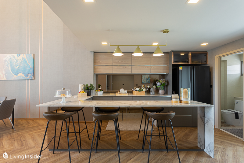 อีกทั้งยังมีประตูหลังบ้านเป็นกระจกใสเชื่อมออกไประเบียง ขณะเดียวกันก็สามารถช่วยระบายกลิ่นอาหารออกไปด้านนอก และดึงแสงธรรมชาติกลับเข้ามาภายในห้อง ทำให้โซนนี้ดูไม่อึดอัดจึงกั้นห้องได้สบายมาก ติดกันเป็น ห้องน้ำ Powder Room คล้ายกันกับชั้นล่าง