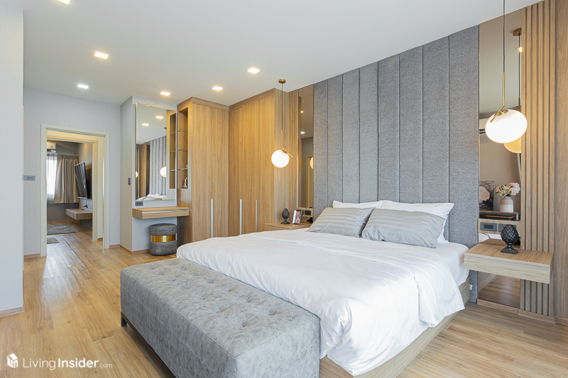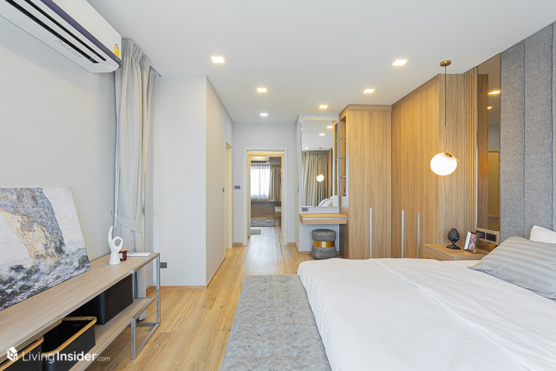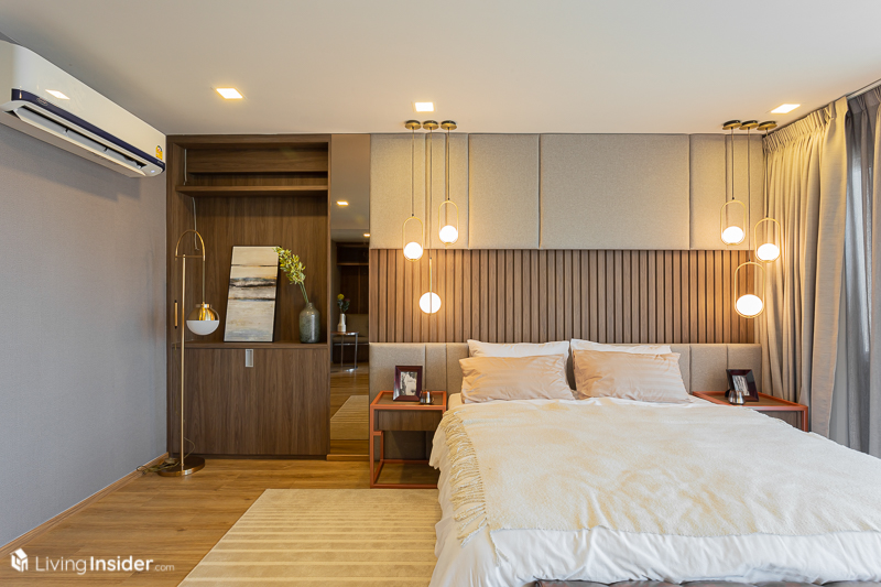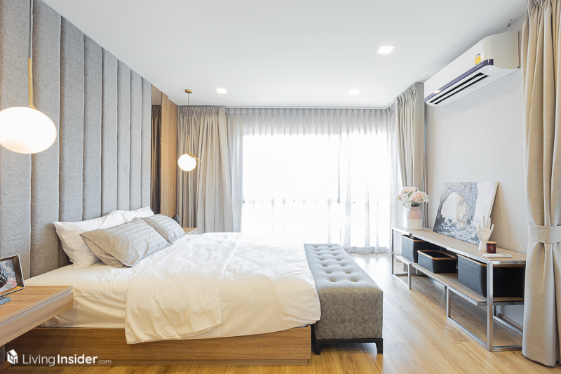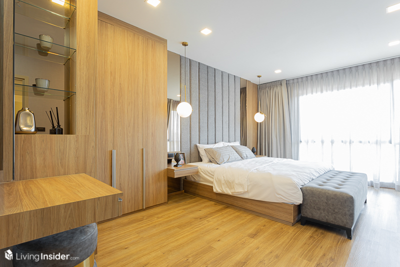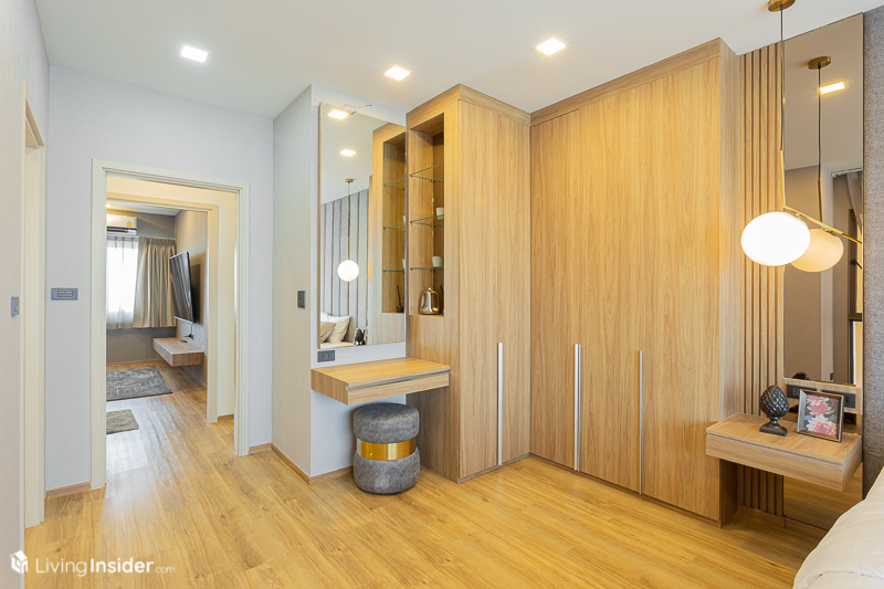 ฝั่งตรงข้ามจะเลือกบิวท์อินหรือซื้อชั้นวางทีวีมาวางก็ยังไม่รู้สึกเกะกะ ต่อให้วางสตูลที่นั่งปลายเตียงแล้วก็ยังเดินผ่านได้สะดวกสบาย