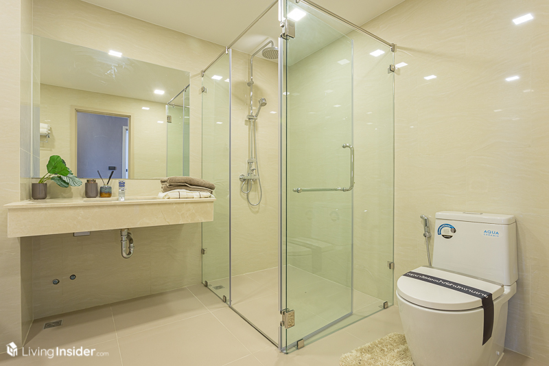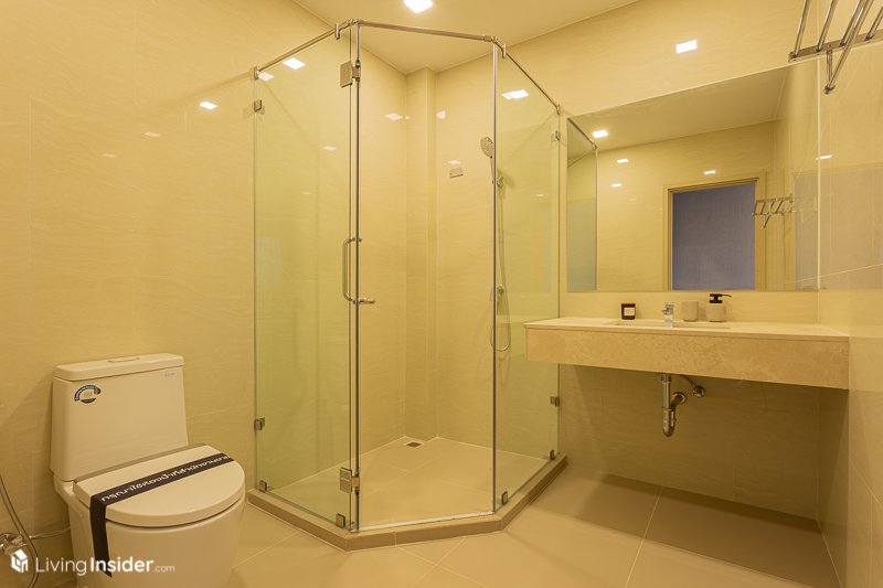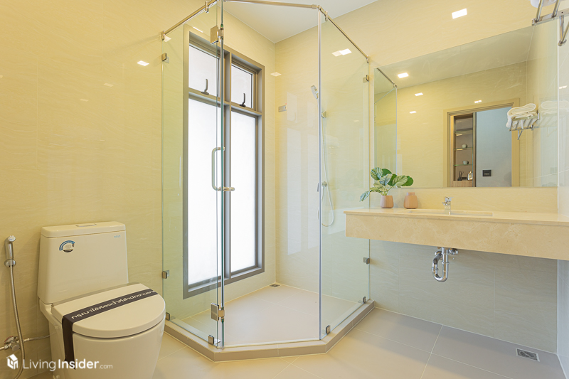 มีห้องน้ำพร้อมพื้นที่อาบน้ำให้พร้อมใช้งาน แยกส่วนเปียกส่วนแห้งด้วยฉากกั้นอาบน้ำวัสดุแบบนิรภัย ไว้ให้เรียบร้อย