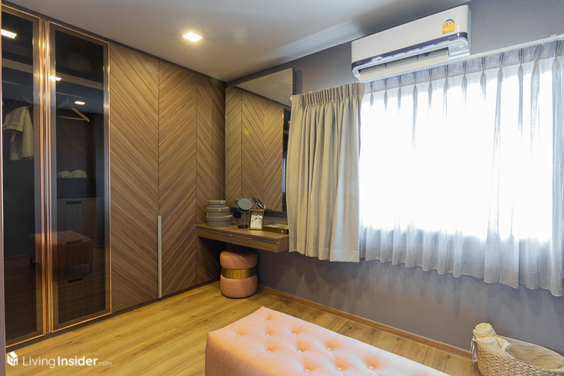 อีกห้องหนึ่งอยู่ด้านหน้าบ้าน ลักษณะคล้ายกับ Master Bedroom ข้างล่าง สามารถวางเตียง 6 ฟุต และโต๊ะข้างหัวเตียงได้สบายๆ ติดกันมีพื้นที่ให้บิวท์อินตู้เสื้อผ้าที่จุเสื้อผ้าได้เยอะแน่นอน พร้อมบิวท์โต๊ะเครื่องแป้งให้อยู่ติดกันไปด้วยเลย
