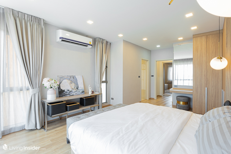 ไม่ให้ขาดตอนเราเดินไปดูที่ชั้น 3 โดยพื้นที่ทั้งหมดคือส่วนของ Master Bedroom แยกสัดส่วนแบ่งหน้าบ้านและหลังบ้าน ฝั่งซ้ายมือหน้าบ้านคือส่วนของห้องนอน ตกแต่งแบบเรียบง่ายเหมาะแก่การนอนหลับพักผ่อน วางเตียงขนาด 6 ฟุตหรือใหญ่กว่านั้น ก็ยังมีพื้นที่เหลือให้วางโต๊ะหัวเตียง และยังมีสเปซช่องว่างไว้เป็นมุมนั่งเล่นก่อนเข้านอนได้อีกด้วย