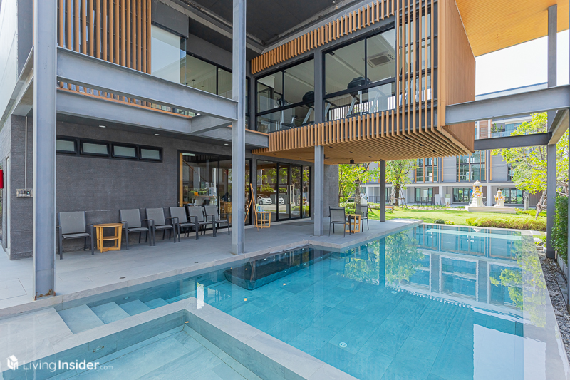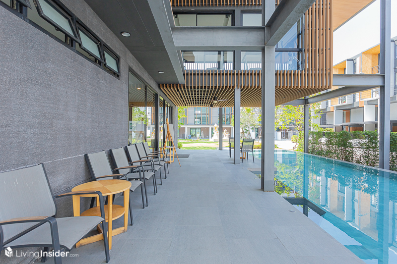 แต่ก่อนจะไปเยี่ยมชมบ้านตัวอย่าง ขอพาไปดู Facility กันก่อน โดยมี Club House อยู่ด้านหน้าโครงการ ที่ชั้นล่างเป็น สระว่ายน้ำ ระบบเกลือขนาด 14 เมตร ซึ่งสามารถว่ายน้ำจริงจังได้ เพราะติดระบบเจ็ทว่ายทวนกระแสน้ำ และมีสระเด็กกั้นแยกเพื่อความปลอดภัย