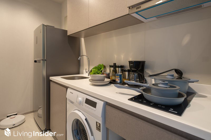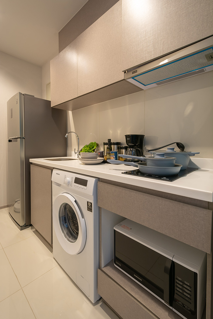 ถัดไปที่ Convergent Kitchen โดยห้องครัวจะอยู่ใกล้ทางเข้าห้องทางซ้ายมือ เป็นครัวปิดพื้นที่กว้างขวางใช้งานได้จริง ทางโครงการบิวท์อินเคาน์เตอร์ครัวยาวเต็มผนัง Top เป็นหินสังเคราะห์ ส่วน Backsplash ติดกระเบื้องเพื่อเช็ดทำความสะอาดได้ง่าย พร้อมตู้เก็บของชั้นบน รวมถึงได้เตาไฟฟ้า 2 หัว และเครื่องดูดควันจาก Franke