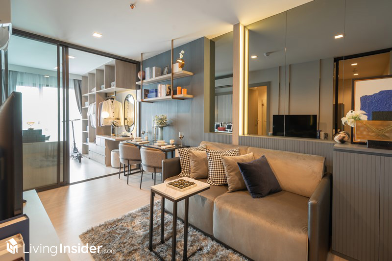 เริ่มตั้งแต่ Convergent Living เข้ามาจะเจอกับห้องนั่งเล่น โดยขวามือมีสเปซไว้สำหรับวางหรือบิวท์อินตู้รองเท้า พร้อมวางโซฟา 2 ที่นั่ง ส่วนฝั่งซ้ายมือเป็นส่วนของชั้นวางทีวี เชื่อมต่อกับพื้นที่นั่งกินข้าววางโต๊ะขนาด 2 ที่นั่งได้เช่นเดียวกัน
