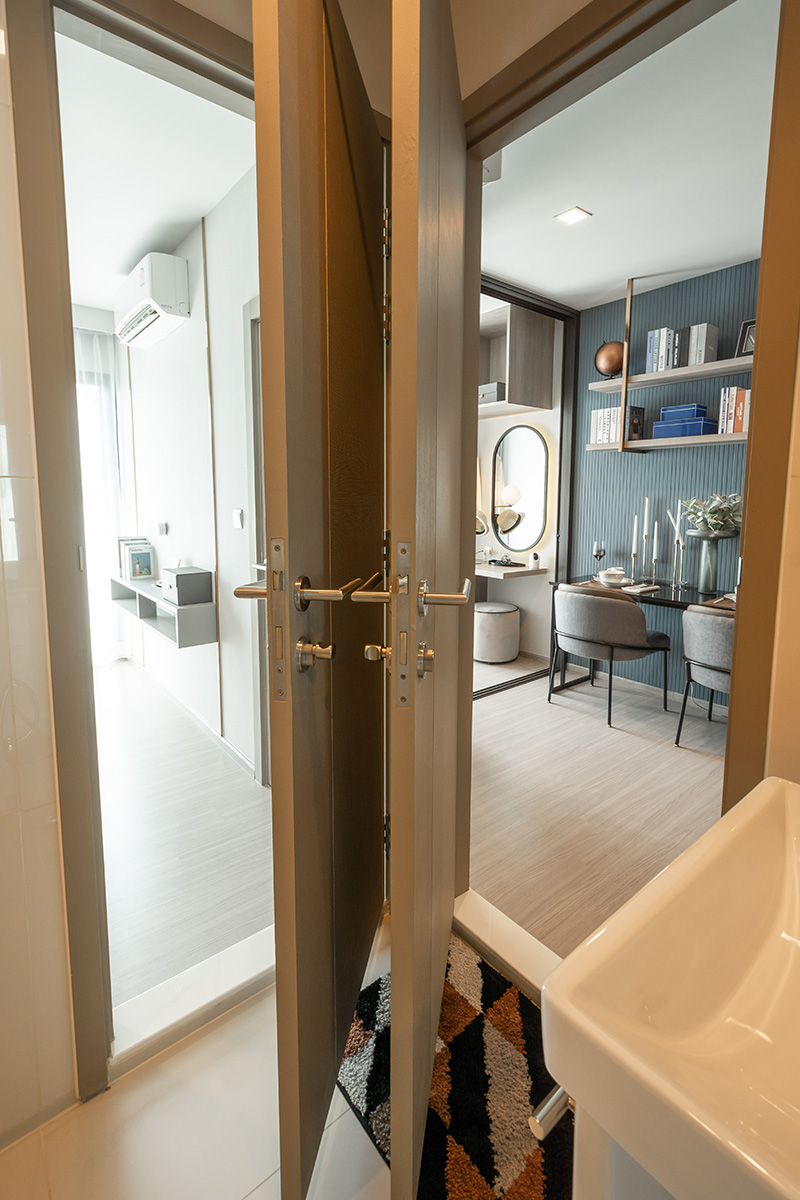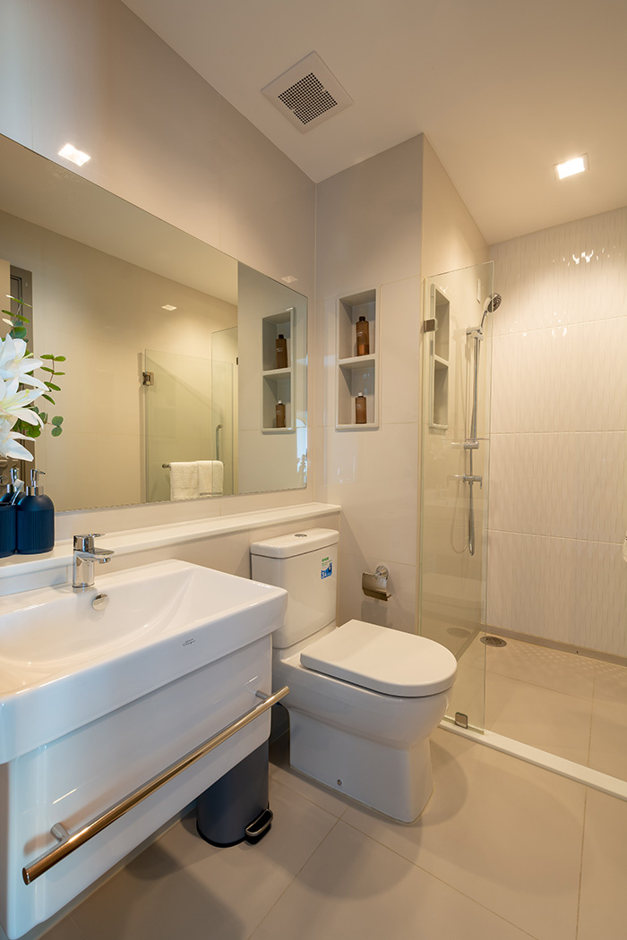 เขยิบไปอีกนิดจะเป็นส่วนของ ห้องน้ำ ให้สุขภัณฑ์มาครบ รวมถึงติดตั้งกระจกนิรภัยแยกส่วนเปียกส่วนแห้งมาให้พร้อมใช้งาน แต่ที่ชอบคือการทำทางเข้า-ออกให้ 2 ทาง คือตรงห้องนั่งเล่น และในห้องนอน เพื่อความสะดวกสบายของผู้อยู่อาศัย