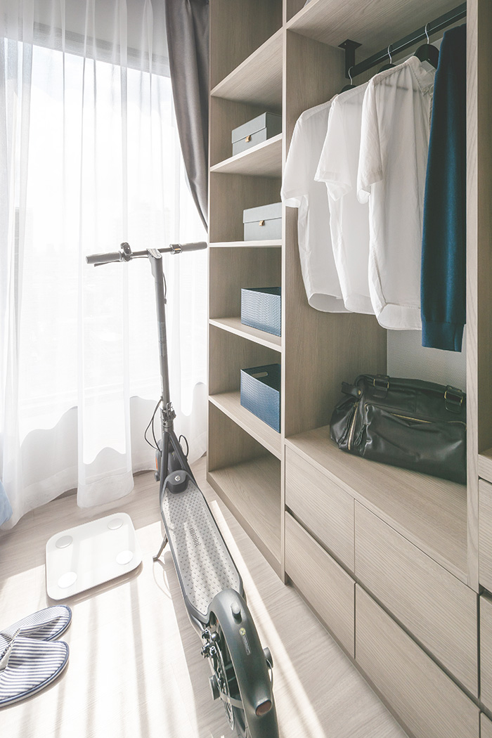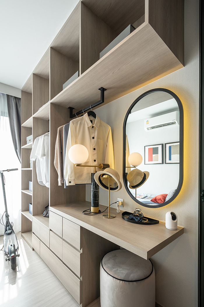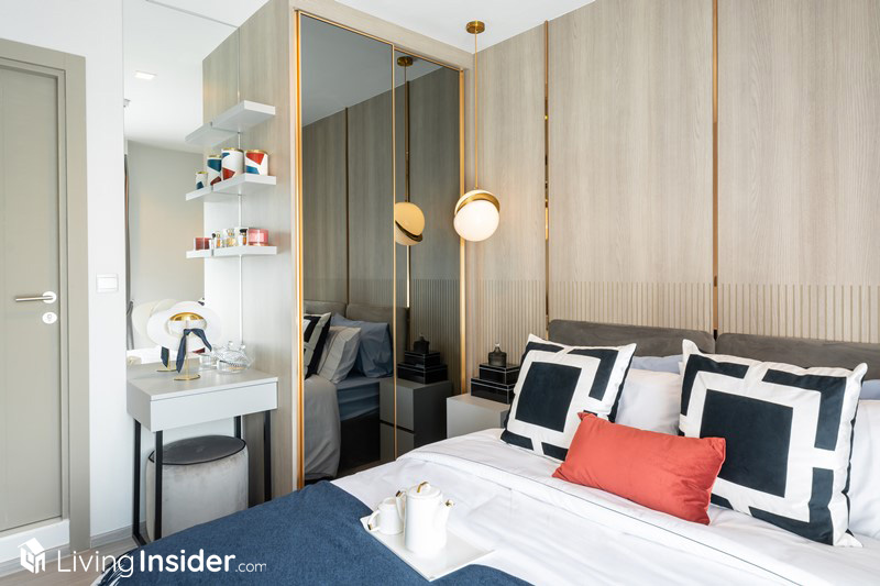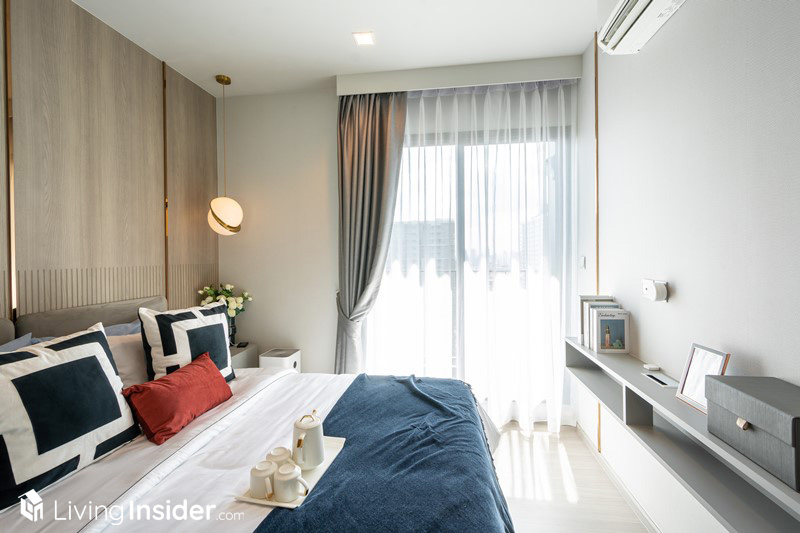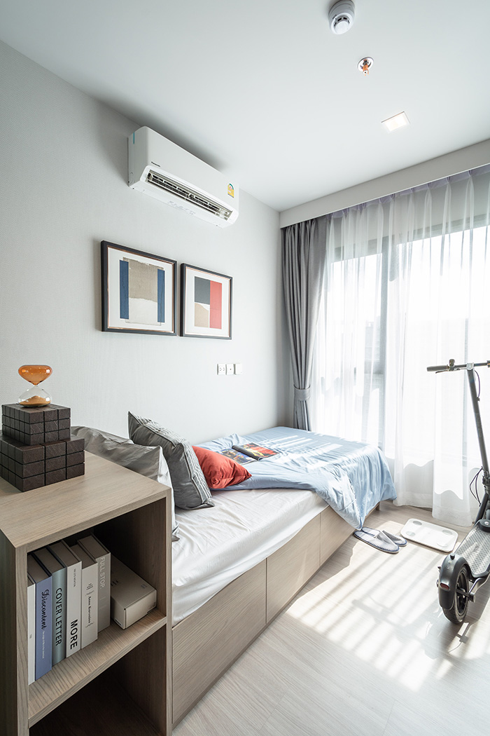 ปิดท้ายที่ Convergent Bedroom ห้องมีขนาดใหญ่ประมาณหนึ่งเลย วางเตียง 5 ฟุต ตู้เสื้อผ้า โต๊ะเครื่องแป้ง ชั้นวางทีวีแบบติดผนังแล้ว ก็ยังมีพื้นที่เหลือเฟือให้เดินได้สะดวกสบาย โดยระเบียงจะอยู่ในห้องนอน ทำให้แสงธรรมชาติส่องเข้ามาได้อย่างทั่วถึงเพิ่มความโปร่งโล่ง