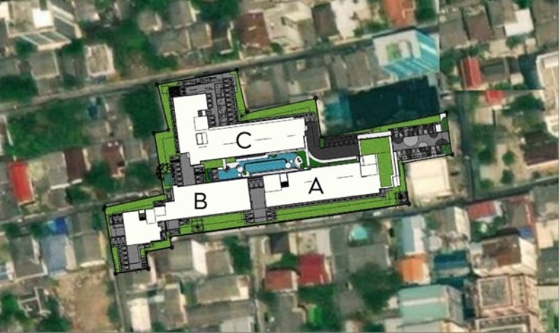จากเอกสาร EIA Aspire รัชโยธิน แบ่งเป็น 3 อาคาร (A-B-C) Low-Rise 8 ชั้น รวม 633 ยูนิต, ที่จอดรถ 192 คัน (ไม่รวมซ้อนคัน) จัดวาง Layout ตามภาพ ใช้เวลาก่อสร้างรวมรื้อถอน 24 เดือน หลังจากผ่านการอนุมัติ EIA คาดว่าแล้วเสร็จปี 2567